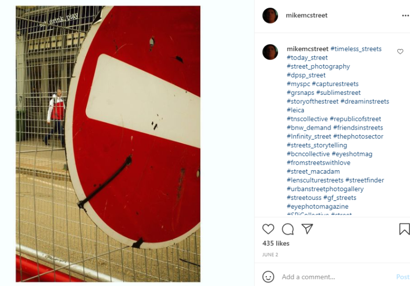 I think some of McILvaney's work is really creative, he works with the landscape, opposed to creating it. The M on the McDonald's cup ties in nicely with the double yellow lines, where as the white of the cup goes well with the star marking. In the image on the right the red of the stop sign works well with the persons body of the coat and the white line through the middle works well with the persons sleeves. McILvaney either creates or waits for that perfect moment to get a shot that work well. This has been influential for me in terms of spending more time creating my images and maybe bringing items along with me to help create my images and slightly change the landscape.