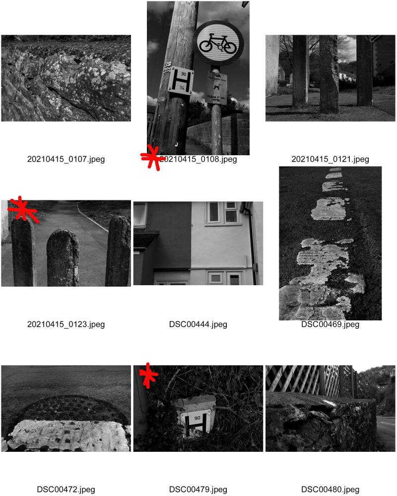 From all of my shoots, I went through all my images on Adobe Bridge with my mum and we star rated them. I chose all the fours and fives and added them into one folder. We then looked at them again and widdled down some of the fours until we only had 33. I then decided before I chose my final images to get them printed via Free Prints as 6x4s. Once they had been delivered we spread them out on the dining room table and began to really think of my narrative, walls, signs and roads. Also making sure the images I picked were smaller images of the landscape. We then began to widdle down yet again. Using my contact sheets also helped my process as I could see them altogether a little smaller.