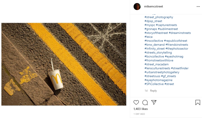 I think some of McILvaney's work is really creative, he works with the landscape, opposed to creating it. The M on the McDonald's cup ties in nicely with the double yellow lines, where as the white of the cup goes well with the star marking. In the image on the right the red of the stop sign works well with the persons body of the coat and the white line through the middle works well with the persons sleeves. McILvaney either creates or waits for that perfect moment to get a shot that work well. This has been influential for me in terms of spending more time creating my images and maybe bringing items along with me to help create my images and slightly change the landscape. The act that he also shoots the landscape as it is really shows how we destroy what we take for granted.